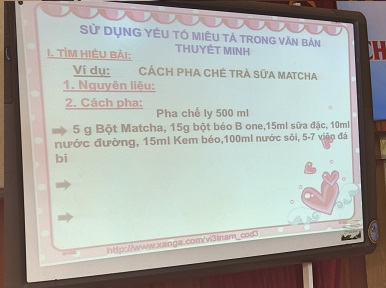 Vâng, và khi hoàn thành phần khởi động giới thiệu mục tiêu dạy học, cô Linh mời mọi người hướng sang dãy bàn đã để sẵn các dụng cụ phương tiện để làm ................... trà sữa ( kkkk ... ) macha ( ohaha). Tiết dạy đã bắt đầu bằng việc tạo hứng khởi và bất ngờ thế đó. Học sinh tươi tỉnh hẳn và chăm chăm nhìn về các bạn cùng lớp được mời lên để thực hiện các công đoạn làm trà sữa ...